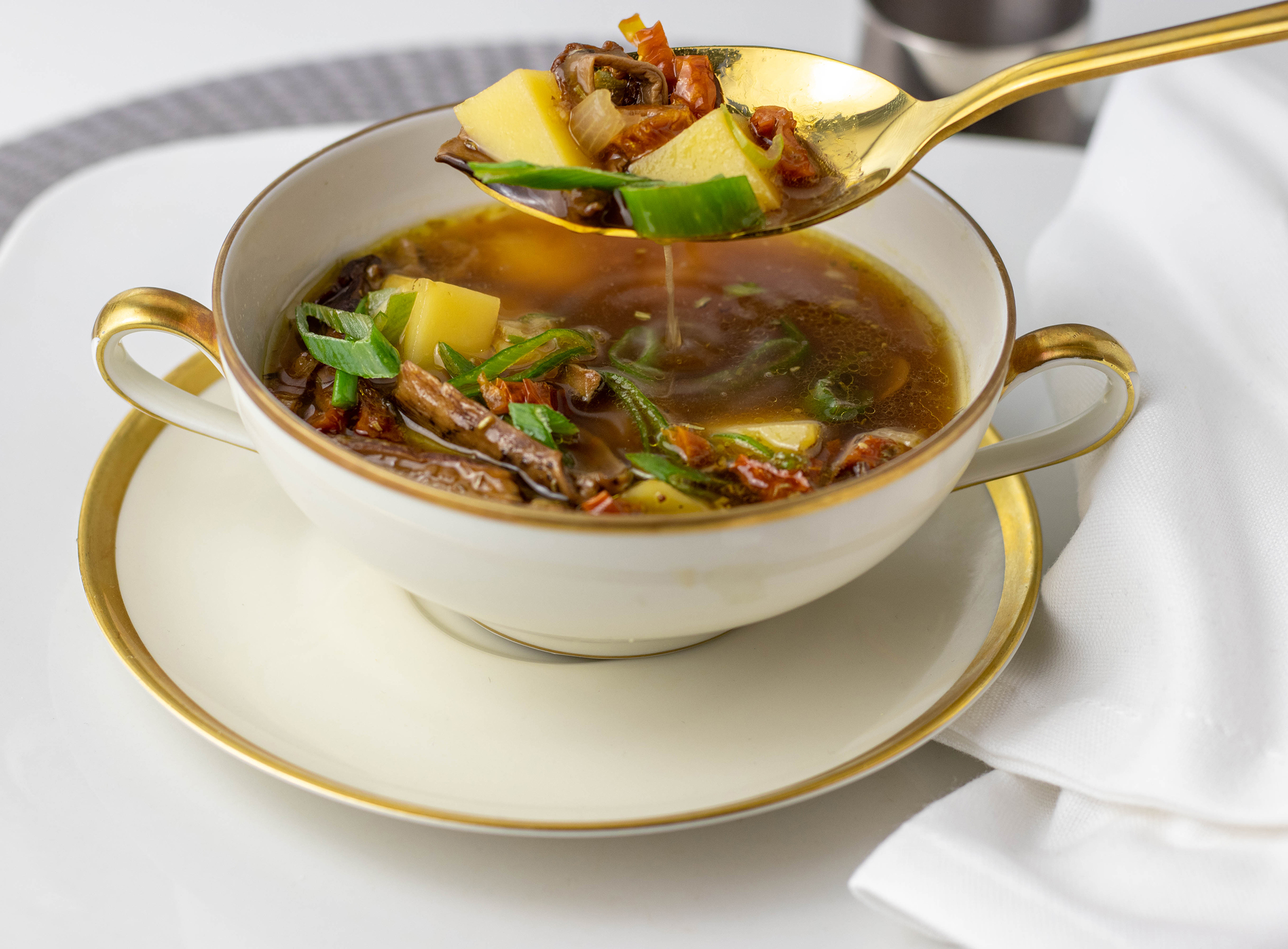 Schlagobers beifügen und die Suppe abermals aufkochen lassenDie Hälfte der Suppe abgießen und mit. 1 Dose Steinpilze 2 ¾ Liter Brühe Instant Salz Pfeffer 6 EL Sherry ½ Bund Petersilie 3 EL saure Sahne Zubereitung Die Zwiebel und den Speck klein würfeln und im heißen Fett. Mit Bouillon ablöschen aufkochen.
